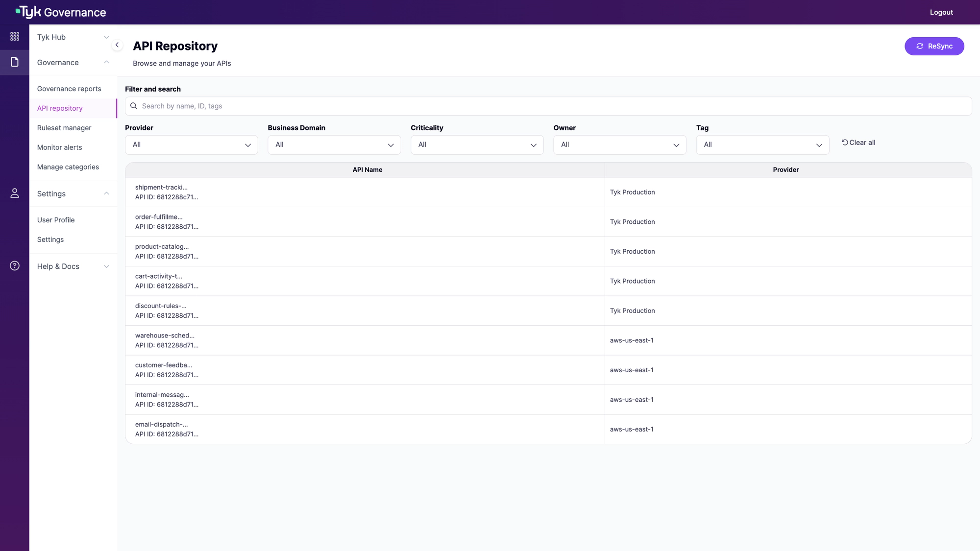 Navigate to the API Repository section in your Tyk Governance Hub to view discovered APIs.